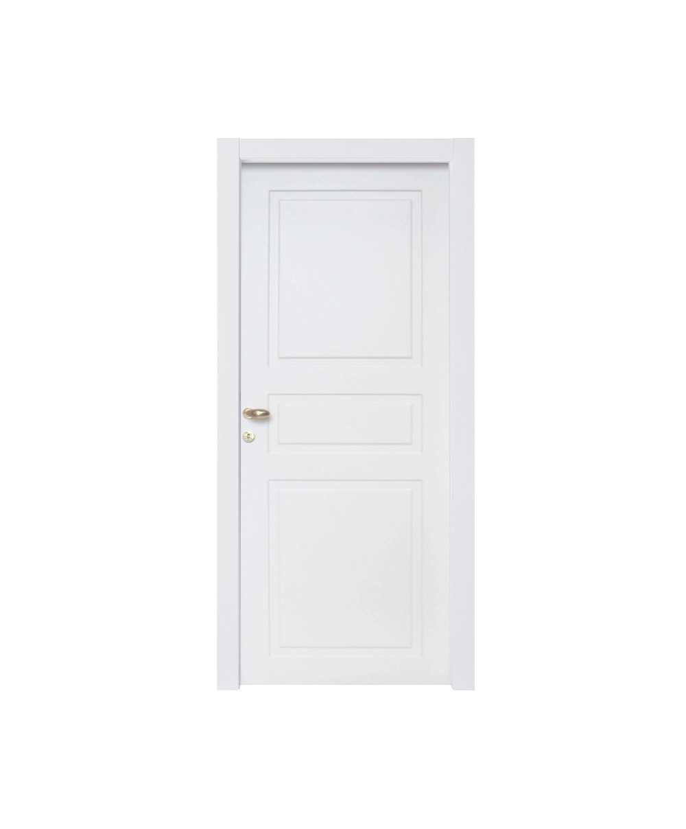 a battente reversibile. Telaio perimetrale compreso di rinforzi in massello di abete. Riempimento in cartoncino trattato. Piani in MDF da 8 mm. Bordatura sui 4 lati in carta melaminica neutra. Composta da: Anta, Telaio completo di traverso, coprifili. Serratura verniciata silver e cerniere coassiali anuba Ø 13 mm maschio-femmina zincate (montate). Dimensioni 70 x h 210 cm. Finitura bianco laccato.