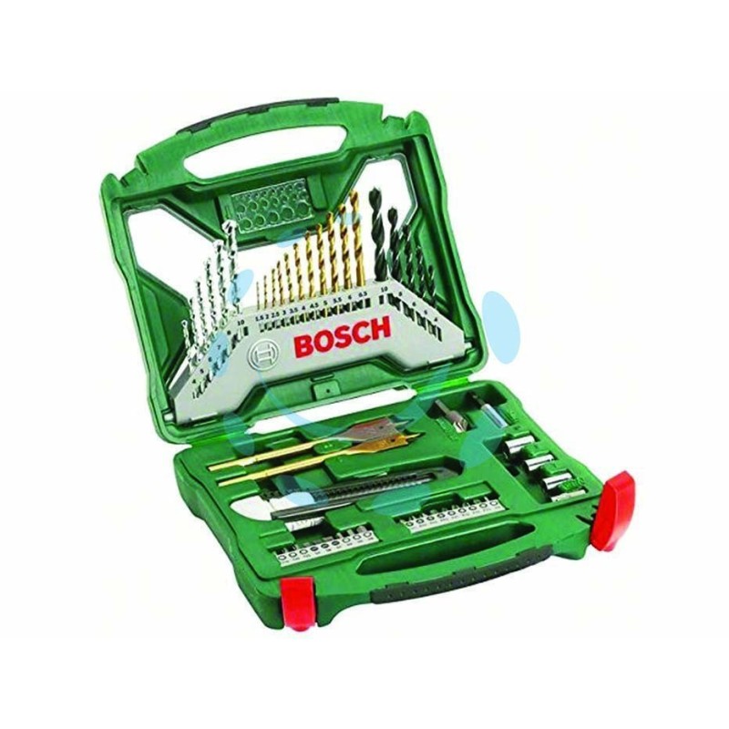 in valigetta di plastica; contiene 11 punte HSS-TIN: ø mm.1,5-2-2,5-3-3,5-4-4,5-5-5,5-6-6,5 + 6 punte a muro: ø mm.4-5-6-7-8-10 + 5 punte perl egno: ø mm.4-5-6-8-10 +2 mecchie: ø mm.16-22 + 18 bit di avvitamento da mm.25: PH 1-2-3 + PZ 1-2-3 + taglio 4-6-7 + HEX 3-4-5-6 + TORX 15-20-25 + bussole ø mm.7-8-10 + innesto bussola + calibro diametri + taglierino + portabit con magnete + svasatore
