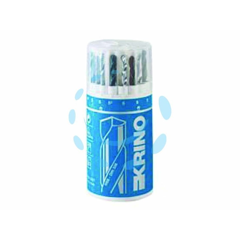 in astuccio cilindrico di plastica; contiene 13 punte HSS ø mm.1-1,5-2-2,5-3-3,5-4-4,5-5-5,5-6-8-10; 6 punte WIDIA ø mm.4-5-6-8-9-10