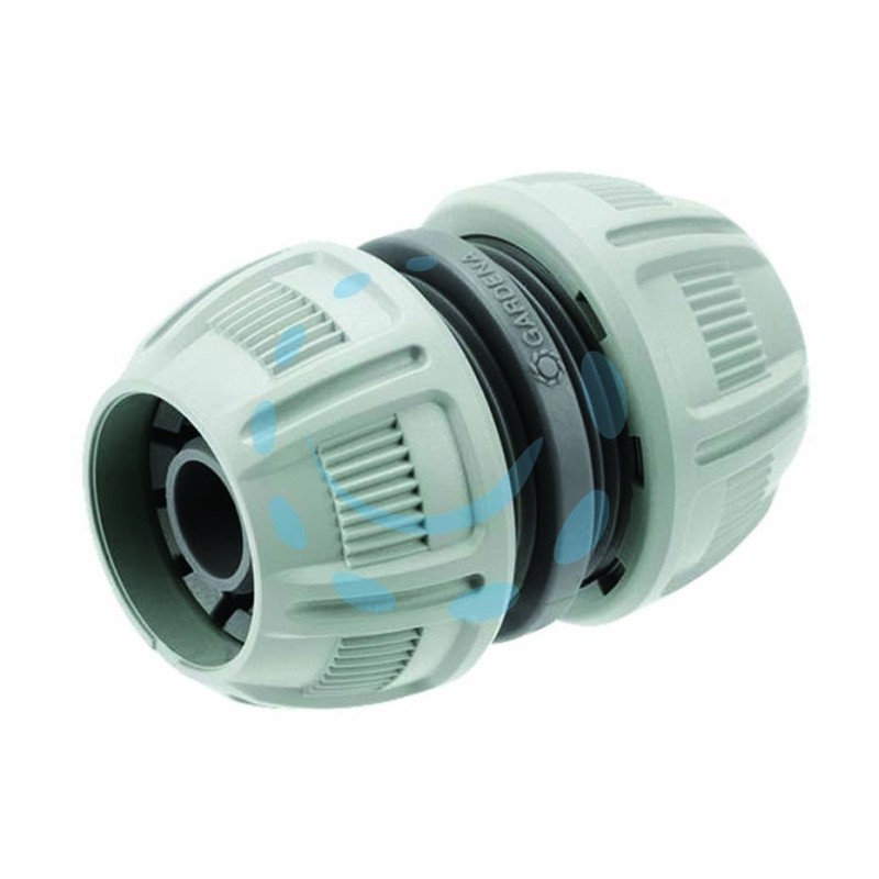 Raccordo riparatore per tubo flessibile. Salva il tubo danneggiato. Unisce i due spezzoni ottenuti tagliando il tubo nel punto della perdita d’acqua.