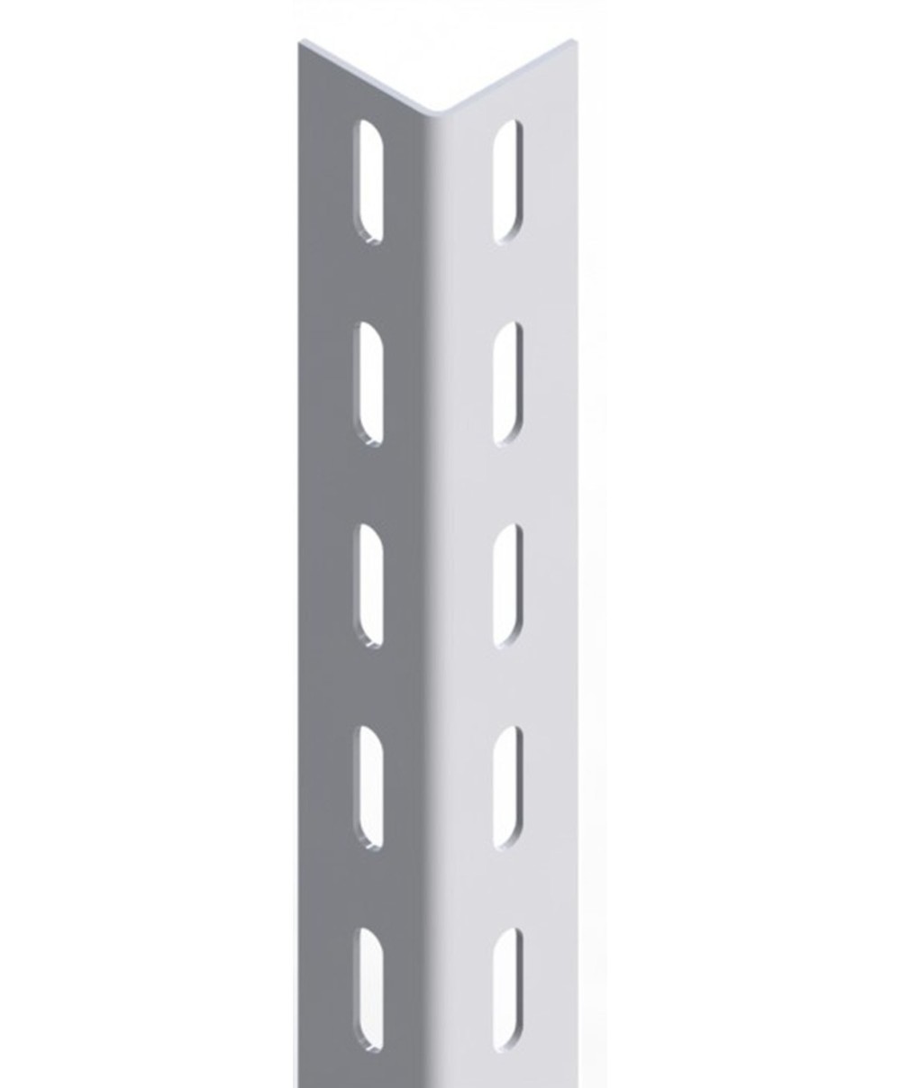 Angolare a bullone in lamiera di acciaio laminata a freddo. Asole ovali 9x30 mm, passo 50 mm. Sezione a L a lati uguali 40x40x1,8 mm. Lunghezza angolare 300 cm. Colore grigio Ral 7035.