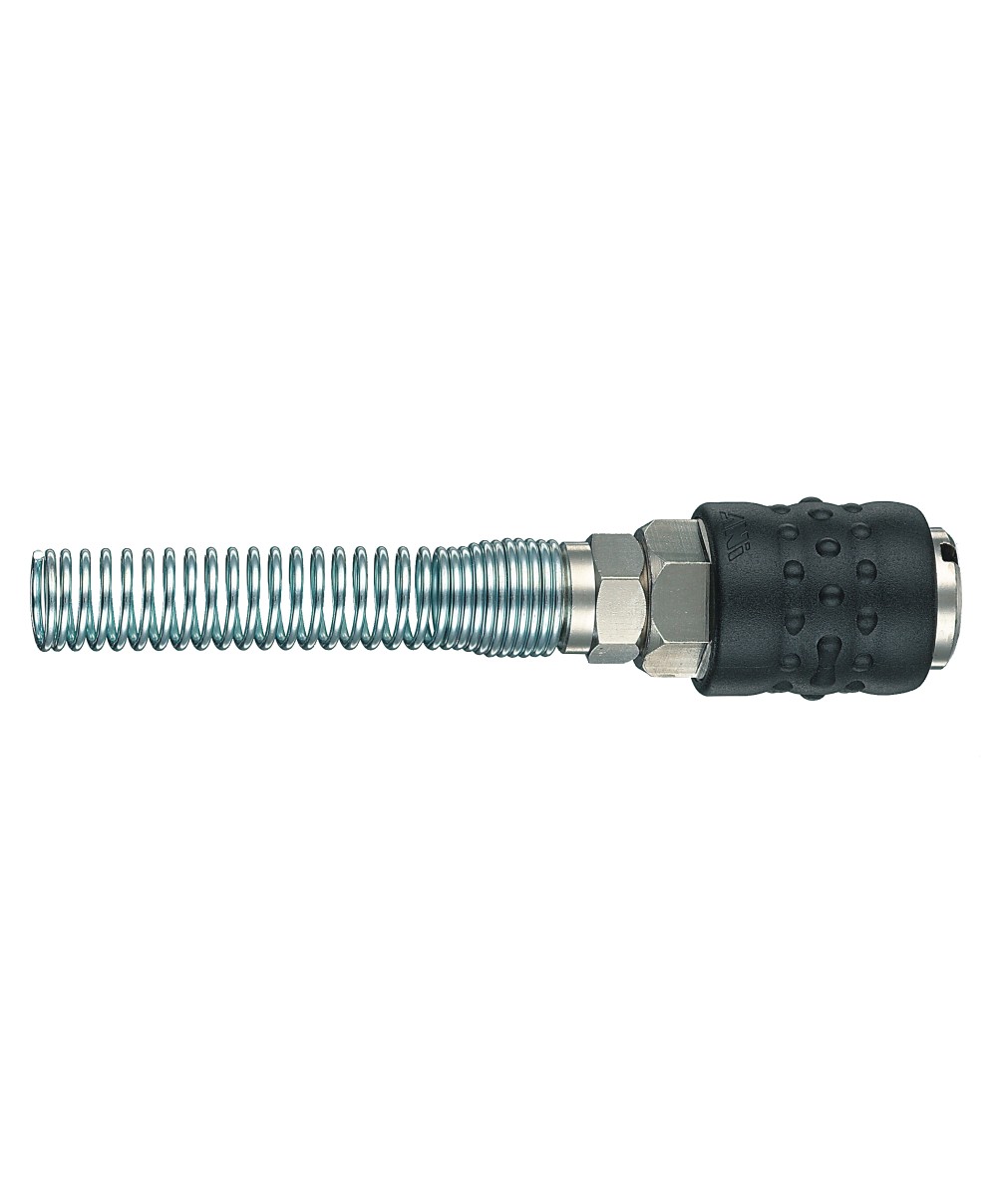 Art. 64 MF innesto per rubinetto rapido con molla a spirale. Sezione 8x10 mm. Pressione max consigliata 18 bar. Corpo e dado di bloccaggio in ottone nichelato, molla in acciaio armonico zincato 70 mm. Garnizione in gomma antiolio NBR esenti da silicone. Lunghezza 120 mm. Peso 112 g. Blister.