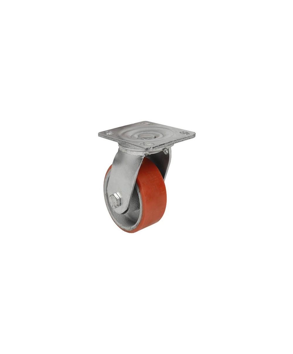 in ghisa rivestita di poliuretano. Supporto in acciaio con piastra girevole 93 x 63 mm. Dimensioni ø 100 x 32 x h 129 mm. Portata max 130 kg.