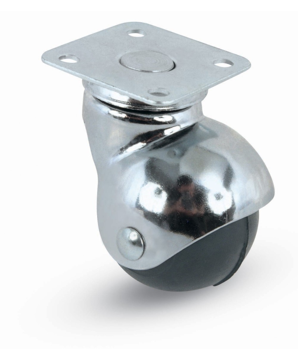in gomma. Supporto a cuffia sferica in acciaio stampato rotante su doppia corona a sfere. Piastra girevole 40 x 40 mm. Dimensioni ø 40 x h 63 mm. Portata 30 kg. Colore cromo.
