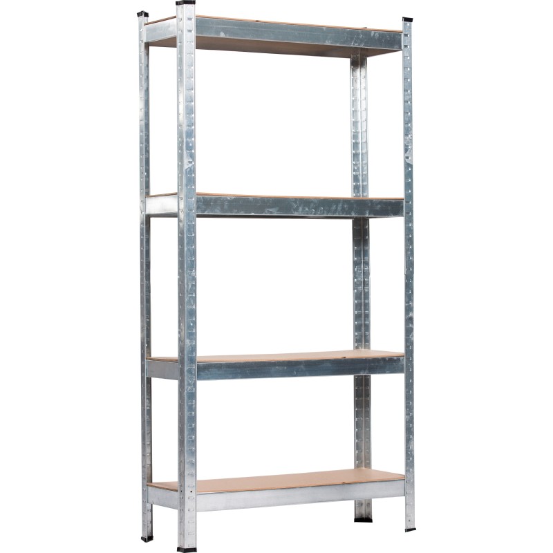 struttura in metallo zincato con incastro a linguetta, senza bulloni. 4 ripiani rinforzati in MDF spessore 4 mm, regolabili. Portata max 60 kg per ripiano (peso uniformemente distribuito). Dimensioni 80 x 40 x h 160 cm.