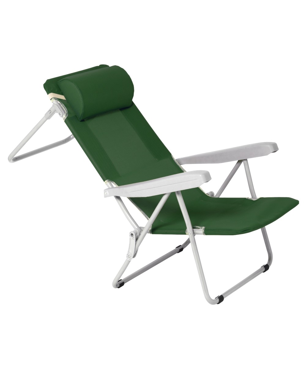 struttura in tubolare di acciaio ø 20 mm Cuscino Oxford spessore 4 cm Braccioli antinfortunistica. Regolabile in 6+1 posizioni Funzione letto. Colore verde