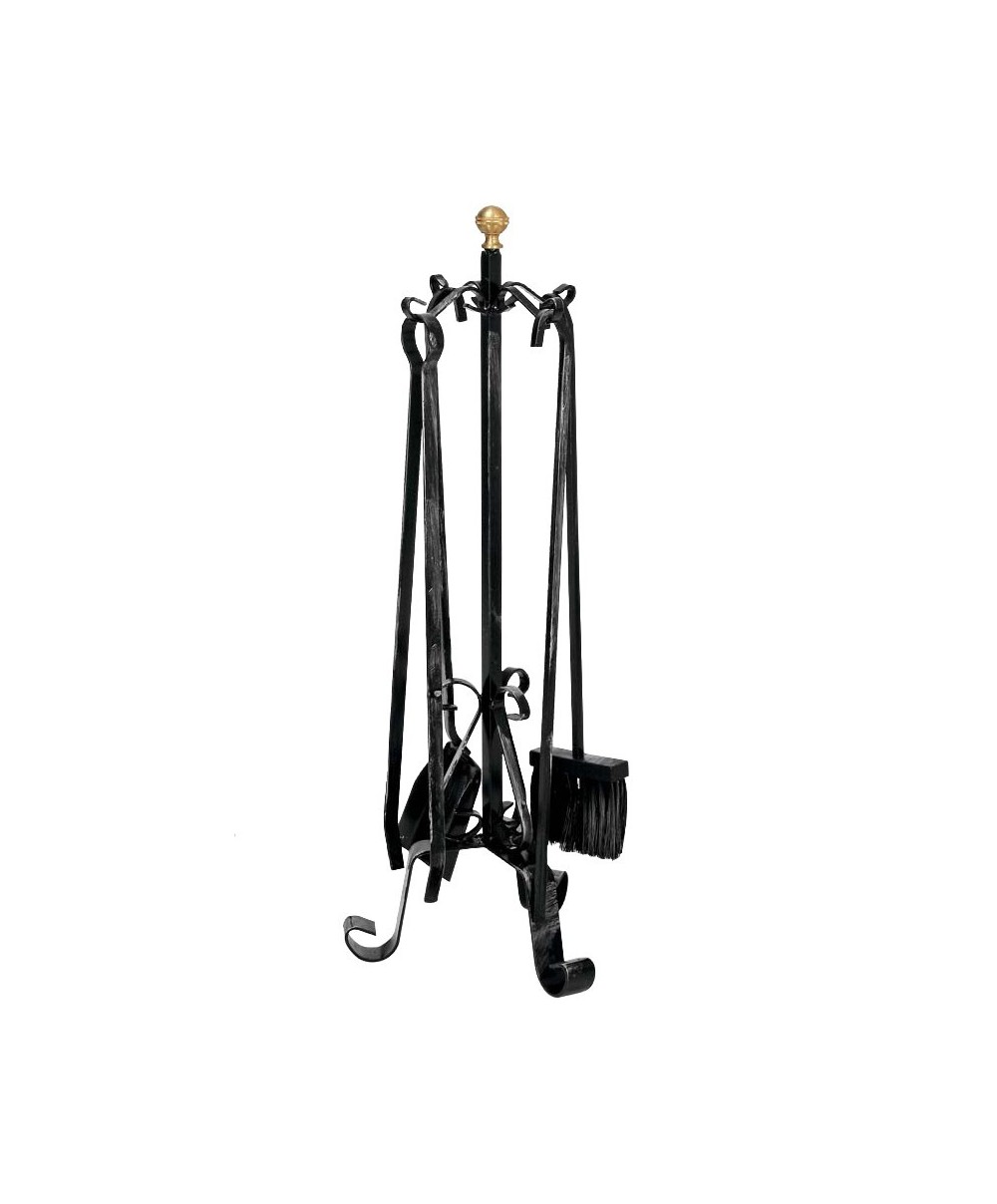 accessori per camino in acciaio verniciato, include un supporto a tre piedi, 1 spazzola, 1 paletta, 1 pinza e 1 attizzatoio. Colore nero.