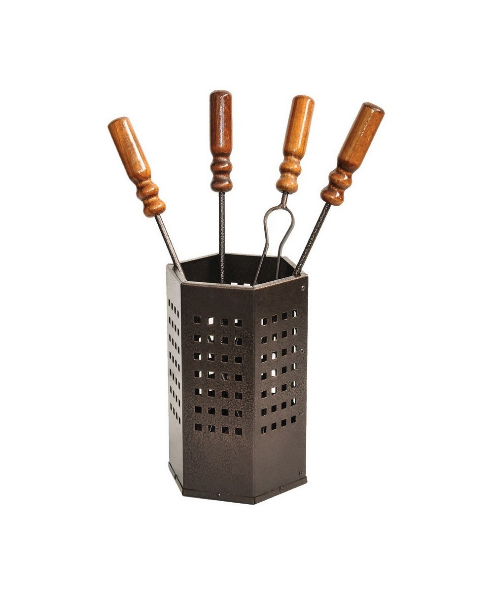 Mod. BOX accessori per camino in acciaio con impugnatura in legno, contenuti in uno stupendo contenitore esagonale forato con all'interno: 1 spazzola, 1 paletta, 1 pinza e 1 attizzatoio. Il design ergonomico delle maniglie ne facilita il prelievo. Dimensioni 18 x 18 x h 50 cm. Colore nero.