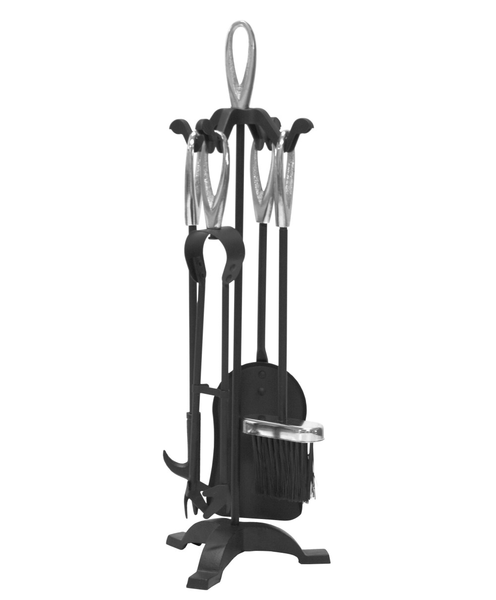 Mod. ELISSE accessori per caminetto in acciaio verniciato. con impugnature ad occhiolo cromo, include un supporto a tre piedi, 1 spazzola, 1 paletta, 1 pinza e 1 attizzatoio. Altezza 65 cm. Colore nero.