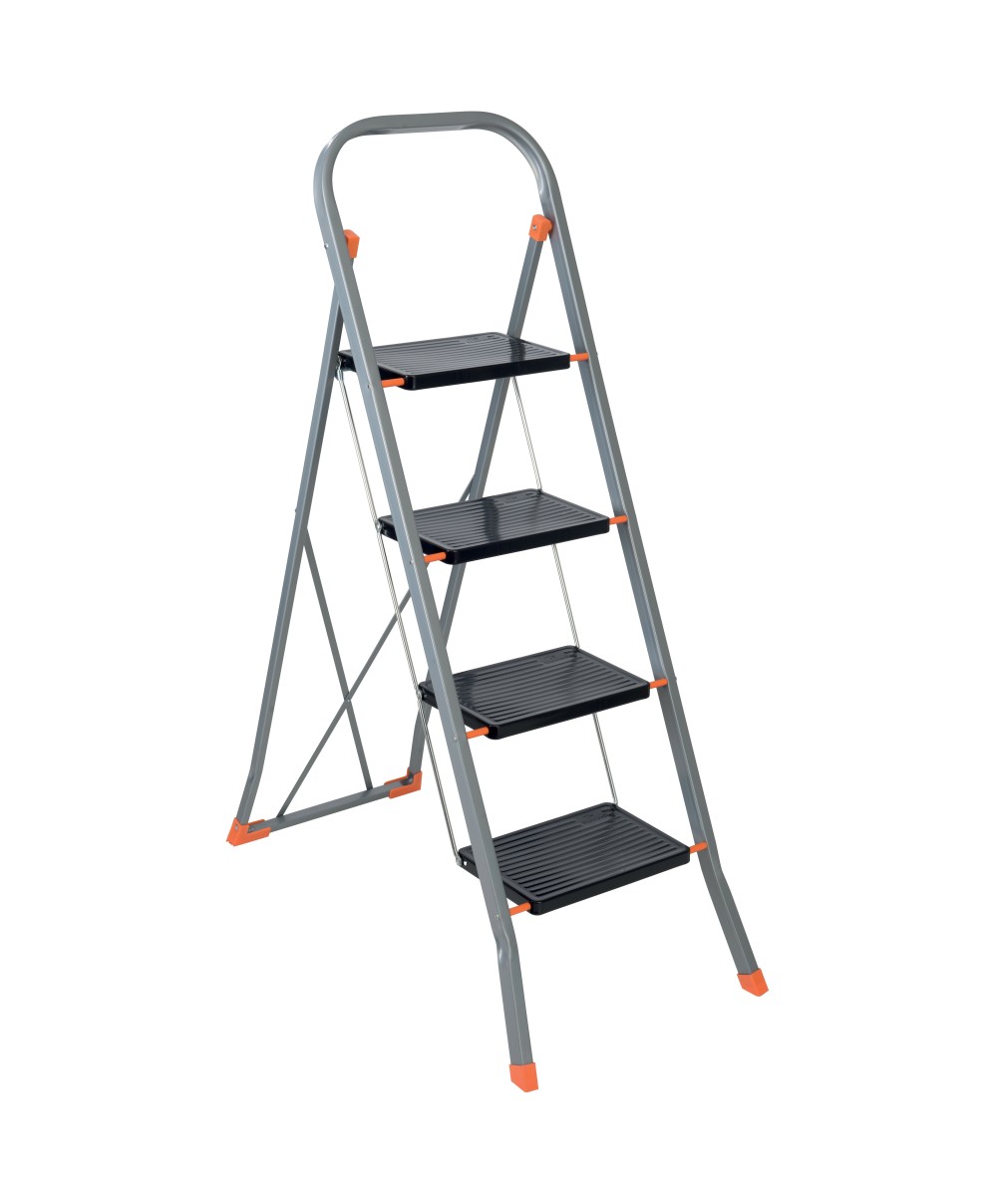 realizzato in acciaio tubolare 20 x 15 mm. 4 gradini acciaio 20 x 30 cm. Verniciato con brillanti polveri epossidiche. Dimensioni aperto 46 x 82 x h 126,5 cm, chiuso 46 x 3,5 x h 141 cm. Altezza pedana da terra 100 cm. Altezza di lavoro utile 290 cm. Portata max 150 kg. Telaio grigio, gradini neri, plastiche arancioni. Peso 7,8 Kg.