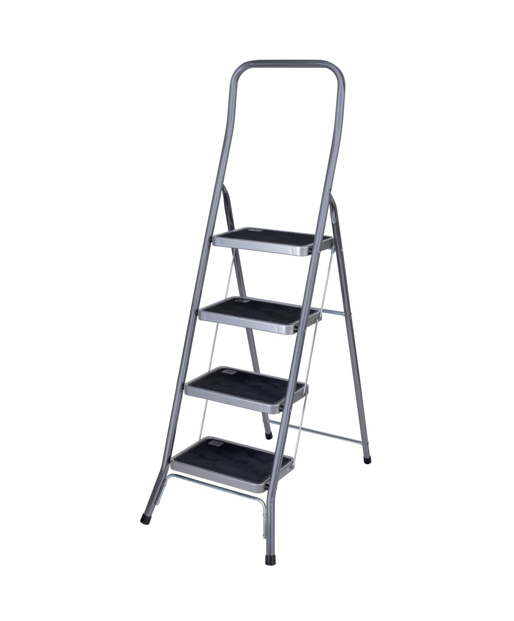 in tubolare di acciaio 28 mm anteriore e 25 posteriore. Gradini in acciaio ricoperto in gomma antiscivolo nera 37 x 25 cm, con tasto di bloccaggio. Altezza da terra quarto scalino 97 cm. Chiusa ha uno spessore di soli 6 cm e unaltezza di 165 cm. Dimensioni aperta 56 x 90 x h 158 cm. Altezza di lavoro utile 277 cm. Portata max 150 kg. Colore grigio. Peso 7,5 Kg