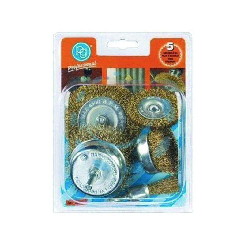 gambo ø mm.6, 1 spazzola circolare ø mm.50, 1 spazzola circolare ø mm.75, 1 spazzola a tazza ø mm.50, 1 spazzola a tazza ø mm.70, 1 spazzola a pennello ø mm.16