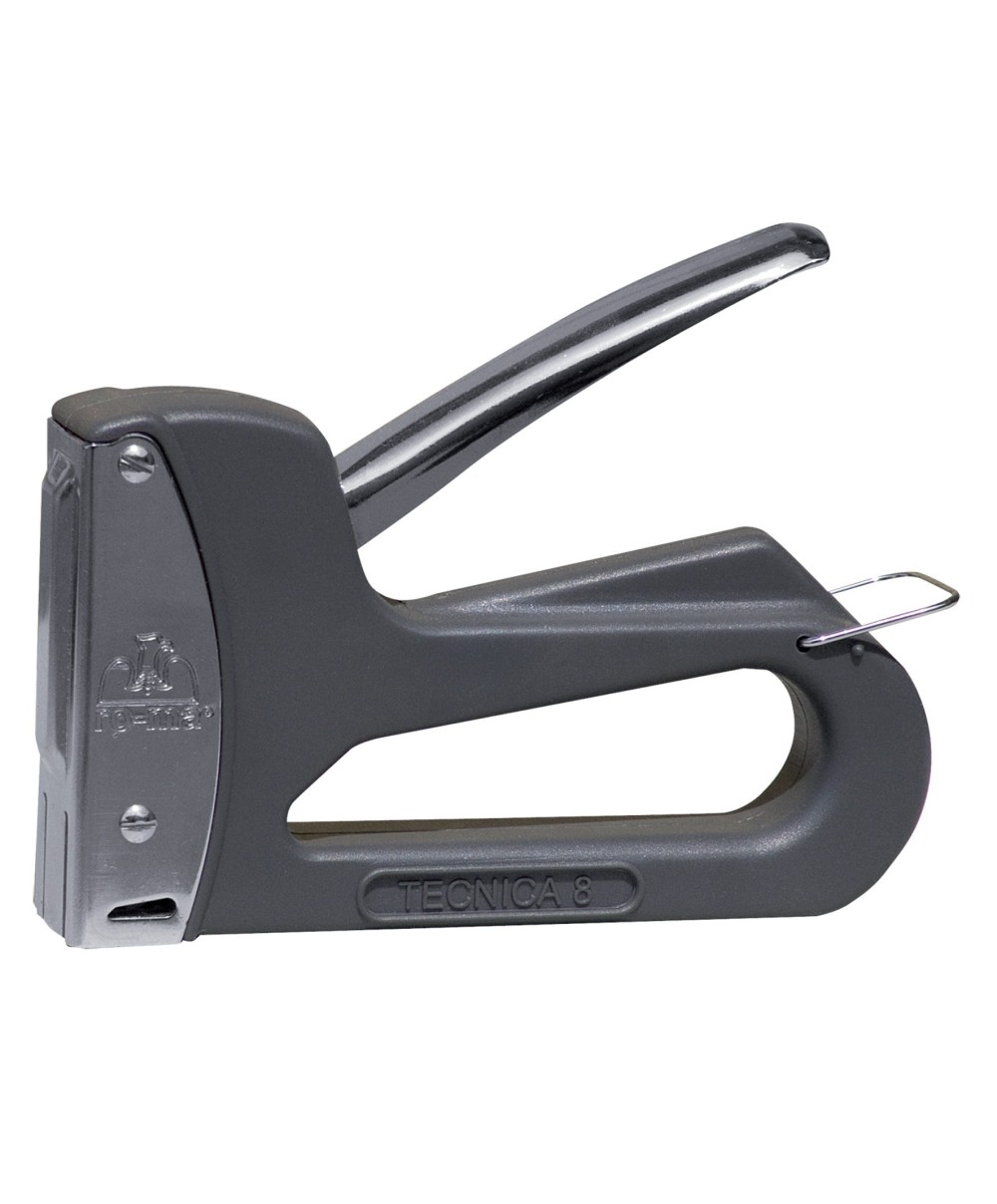 Mod. TECNICA 8 corpo in resina ABS antiurto 20 fibra di vetro e frontale in acciaio cromato. Leva in acciaio nichelato. Blocco maniglia. Per lavori di decorazioni e fissaggio di tappezzeria, ricoperture di divani e mobili. Per fissare tutti i tipi di carta e stoffa, rivestire sedie e decorare vetrine. Carica inferiore anti inceppamento. Per punti con passo 11,2 mm e altezza 58 mm Monta punti 105 - 108. Peso 0,33 kg.