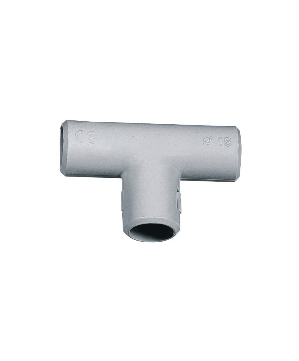Serie TI - Derivazione a T per la connessione tra due tubi dello stesso diametro. Resistenza al calore anomalo (Glow Wire Test IEC 60695-2-11) no a 960 C. Grado di protezione IP 40. Colore grigio RAL 7035. Diametro tubo 16 mm. Confezione da 2 pezzi.