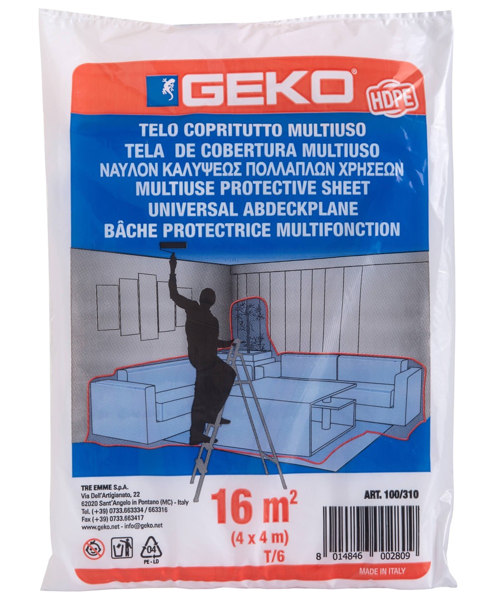 Protegge da vernice, pittura, acqua, polvere ed umidit. Resistente, riutilizzabile, economico, ecologico. I teli in hdpe sono leggeri, performanti e maggiormanente indicati per la protezione del mobili o e di oggetti in genere. Spessore 6 micron Dimensioni 4x4 m