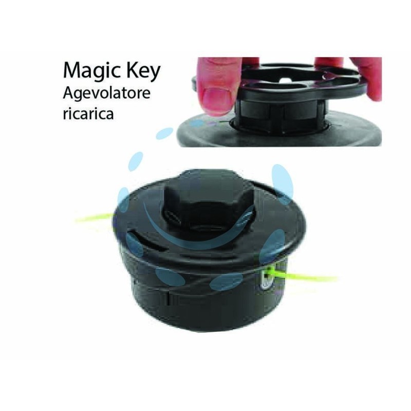 testina professionale - alta capacità di filo, massima facilità e velocità nella ricarica - con Tornado System che previene l'avvolgimento dell'erba sulla coppia conica - prodotta in tecnopolimeri ad alta resistenza - Magic Key in dotazione agevola la ricarica del filo