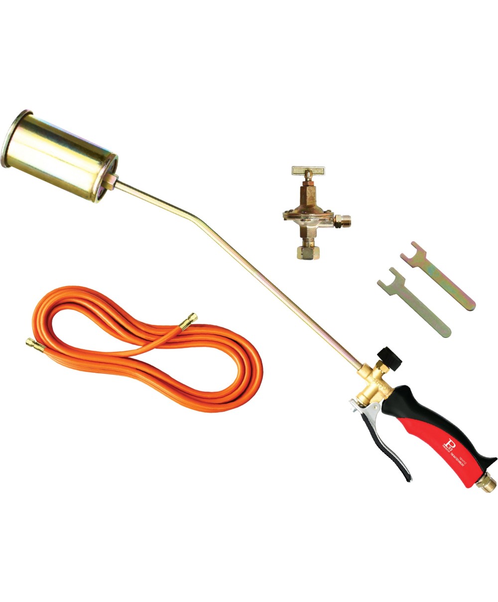 Kit composto da cannello con impugnatura a leva con limitatore di apertura e rubinetto per la regolazione della fuoriuscita del gas. Regolatore ad alta pressione. Tubo gas raccordato in gomma da 10 m con molloni antipiega. Diametro bruciatore 60 mm. Lunghezza totale 75 cm.