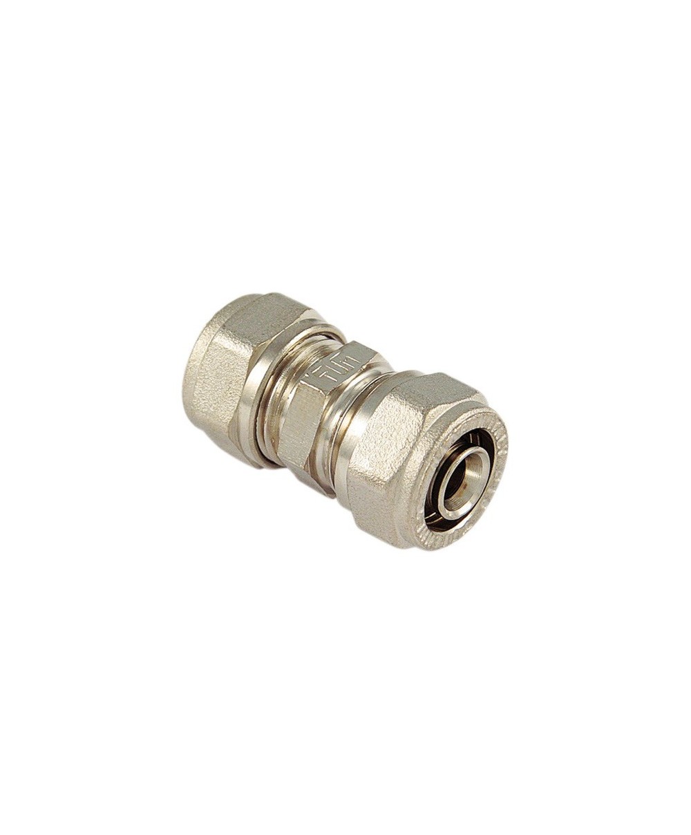 in ottone nichelato. A stringere. Per tubi multistrato, pressione max di esercizio 10 bar. Intermedi. Diametro 20x20 mm.Temperatura di esercizio max 95 C min -20 C.