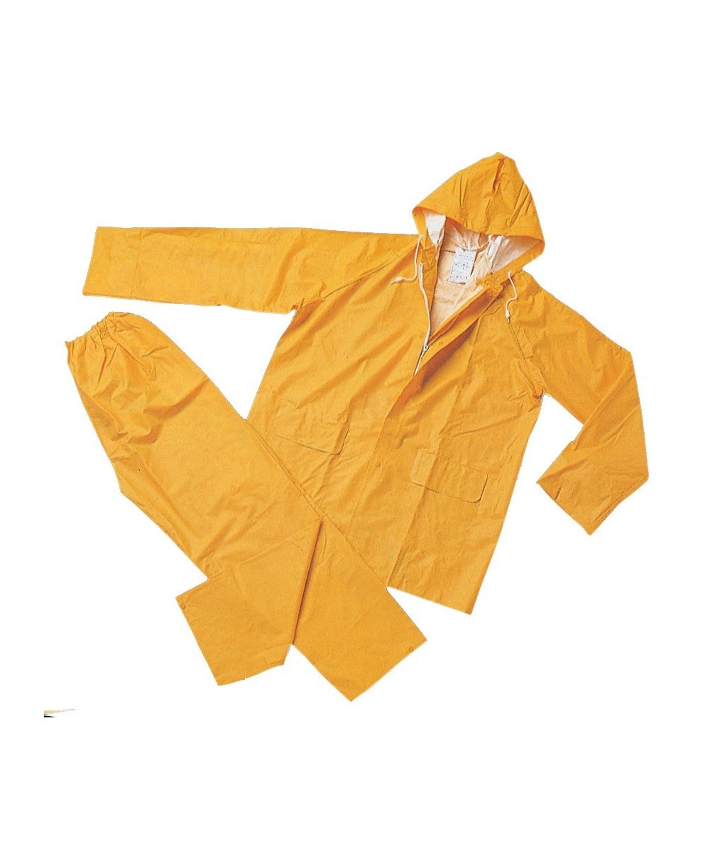 completo giacca e pantalone in PVC -poliestere-PVC. Peso 390 g/m, spessore 0,30 mm. GIACCA Chiusura con cerniera ricoperta da patta e bottoni automatici. Cappuccio fisso con coulisse. Fori di aerazione sul dorso e sotto le ascelle. 2 tasche sul davanti con patta antipioggia. Fondo manica con bottoni automatici. PANTALONE Elastico in vita. Apertura frontale con bottone automatico. Bottoni automatici alle caviglie. CE Ia categoria. Colore giallo. Taglia XXL