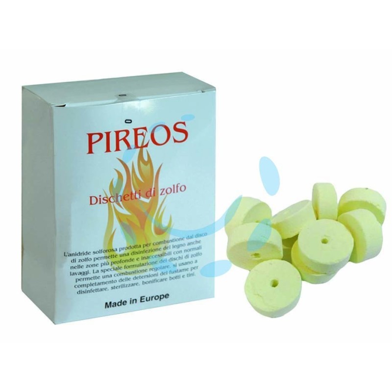 in pastiglie color giallo senape, prodotto con fiore di zolfo che permette una combustione regolare ed uniforme dello zolfo, senza far cadere cenere e senza produzione di idrogeno solforato; indispensabile per la disinfezione del fustame, sanitizzazione e bonifica delle botti in legno di tutte le dimensioni, come completamento di trattamenti detergenti precedenti o durante la conservazione a secco; è possibile impiegare ZOLFO DISCHI per consumare l'ossigeno presente nelle vasche prima del riempimento, una pastiglia da gr.10 consuma l'ossigeno contenuto in 600/700 litri di capacitÃ